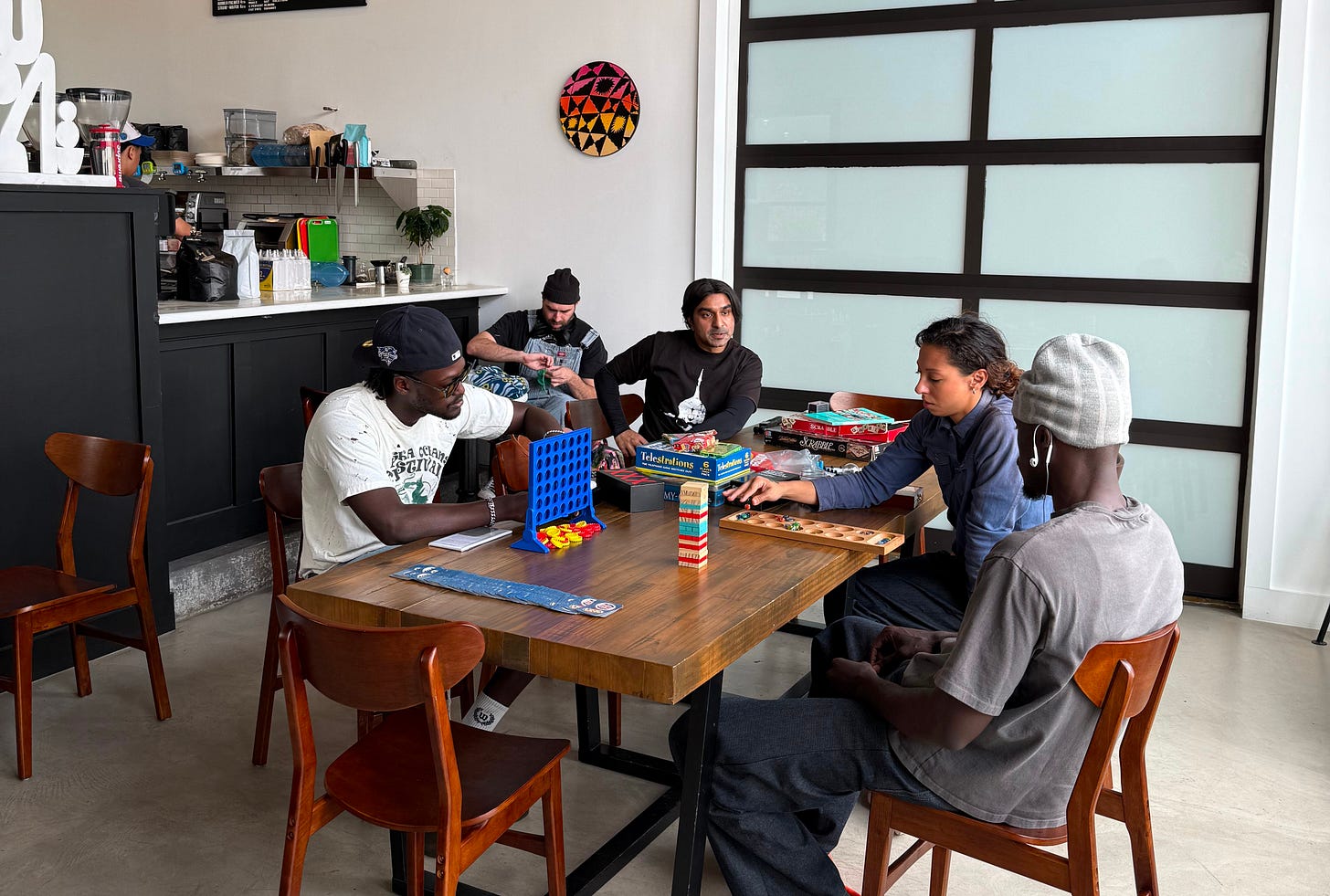 At Black Line Coffee, right beside LA’s vibrant Secret Walls, we laid out chess, mancala, and Connect Four. People showed up solo, paired off, and made new friends as Julian Cullars set the mood on guitar. Bro really played solo four hours !